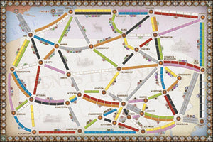 The United Kingdom half of this map collection introduces the concept of technology to TtR. At the start of the game, players can build only one- and two-train routes and only in England. By spending wild cards, players gain the ability to build routes three trains long or longer, in addition to being able to build ferries across water and build train routes in Scotland, Wales and Ireland. Players can also buy bonus cards that allow them to score extra points for taking certain actions during play. The game takes us to the beginning of the railway era, so the title correct for the whole United Kingdom of Great Britan and Ireland.