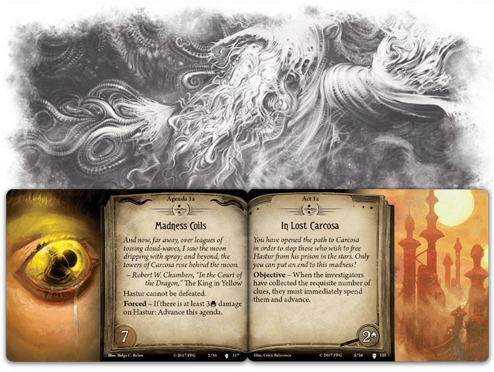 All shall be revealed when you travel to Dim Carcosa, meaning that the locations in this scenario have no unrevealed side. Instead, their reverse sides bear story cards to push your plotlines forward to their final curtain. In this lost realm, insanity is inevitable. But even with your mind fractured and broken, your investigation does not end here. In Dim Carcosa, you are not defeated when you have horror equal to or greater than your sanity. Instead, you journey on, facing impossible odds in the hopes to return home alive.