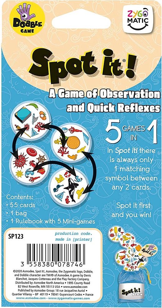 Spot It! comes back in this new eco-conceived packaging, without plastic. The aim remains the same, everyone plays at the same time. 55 cards, each with 8 symbols on them, 5 variants You can play each of the mini-games in order, out of order, or simply keep playing the same one.BEACH CARD GAME: